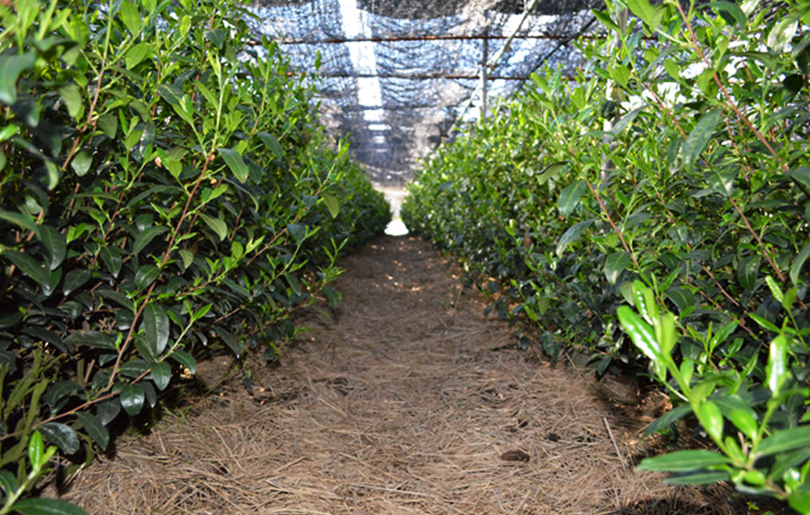 京都・東山茶寮の宇治茶は収穫前の約1ケ月間、茶園におおいをかぶせ、直接日光をさえぎる「覆い下(おおいした)茶園」という方法で栽培しております。